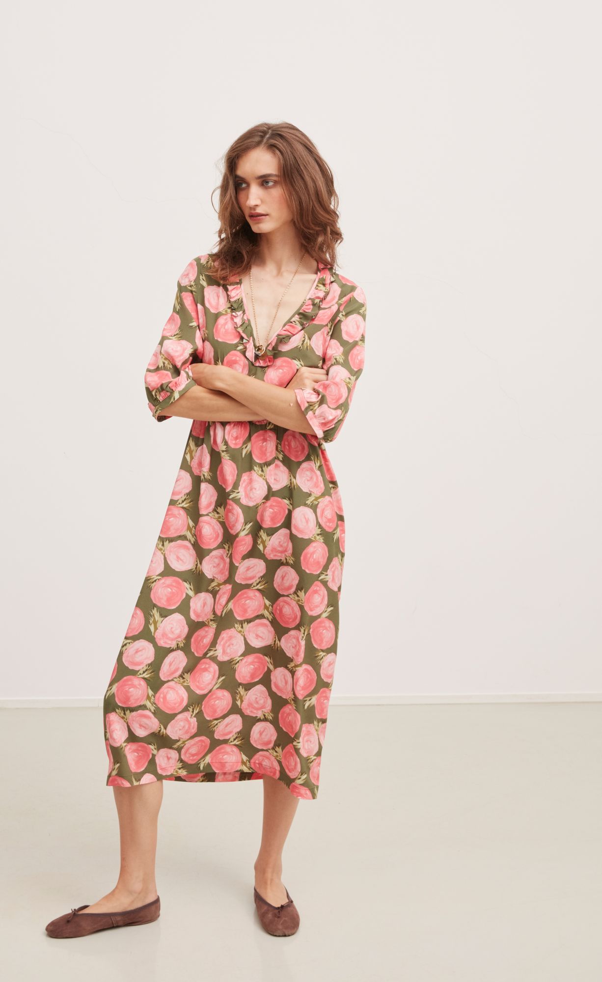 V NECK DRESS WITH ROUCHE